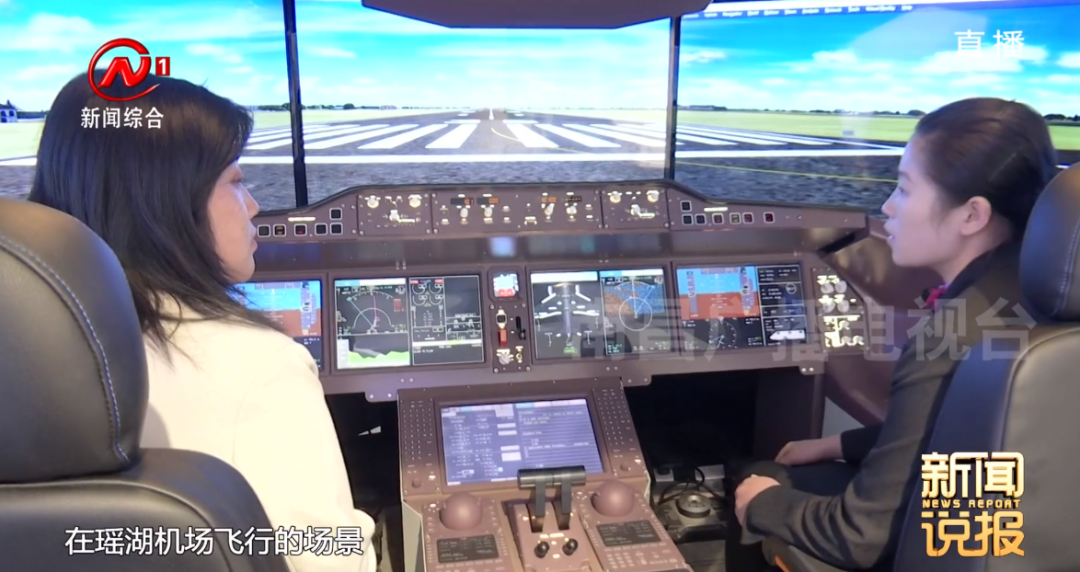 现在我们处在一个依据C919在瑶湖机场飞行的场景所设计的模拟舱,现在我们把助推器往上推,我们脚底的两个键盘是控制方向的。