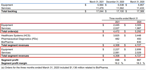 订单方面,医疗板块业务的业总体订单也大幅下降,2021年Q1,,订单业务为45亿美元,而2020年同期为53亿美元,同比下降约15%。