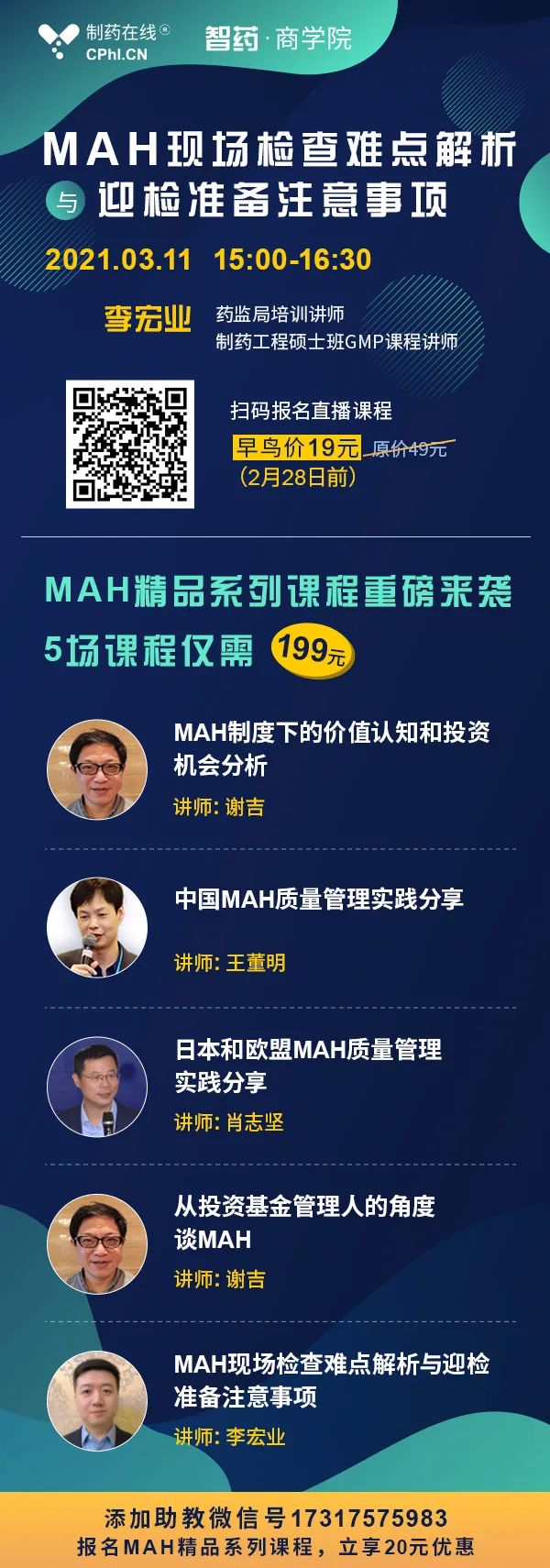 目前国家对于药品全生命周期的管理,包括MAH质量体系的检查管理越来越严格,要求越来越高。为了解决企业对于MAH质量体系建立的要求,了解和掌握国家局和各省局对于MAH现场检查的要求,以及现场检查的重点和难点,包括现场的迎检的准备和注意事项,智药商学院邀请到多个省局和地方局的GMP培训讲师李宏业老师,于3月11日15:00直播分享《MAH现场检查难点解析与迎检准备注意事项》,重点解决企业MAH现场检查的重点难点,以及现场迎检的要求和案例分析。报名从速!