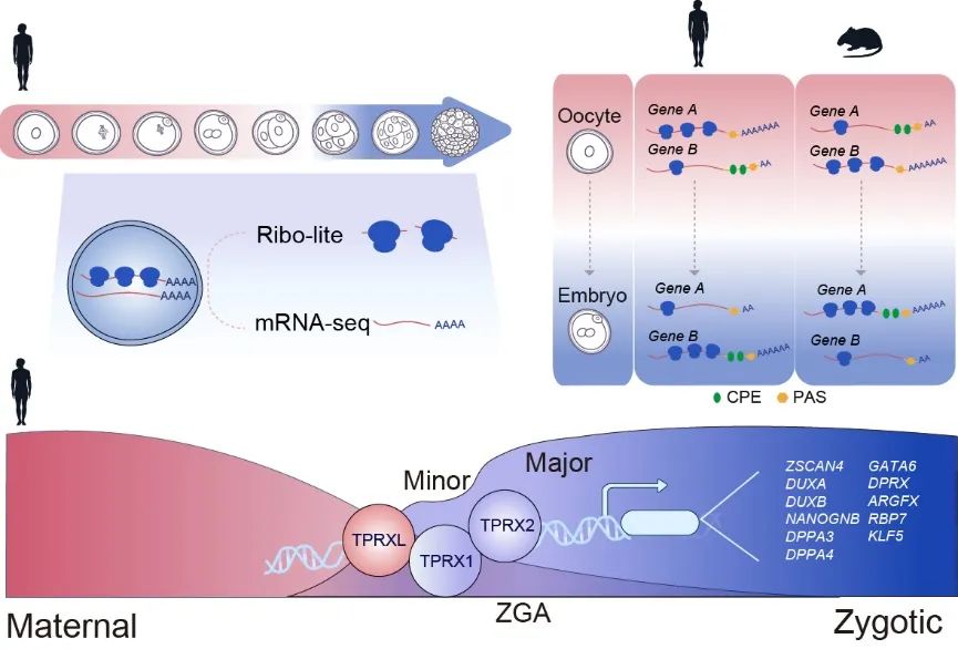 通过结合超灵敏翻译组测序技术Ribo-lite (Ligation-free, ultra-low-InpuT and Enhanced Ribo-seq) 和转录组测序技术 (Smart-seq2) 而开发出的Ribo-RNA-lite (R2-lite) 方法可以进行翻译组与转录组联合测序,该方法被应用于人类卵子和早期胚胎共8个时期。经翻译组分析比较发现,在卵子向早期胚胎转变过程中,人-鼠同源基因中有一半呈现保守的翻译水平动态变化趋势,而另一半呈现不同的翻译水平动态变化趋势,例如编码表观遗传重编程因子、小RNA生物学合成酶等基因。并且这种物种特异性的翻译变化是部分由于 (3’ UTR) 的关键调控序列,例如胞质多聚腺苷酸化元件 (cytoplasmic polyadenylation element, CPE) 和 多聚腺苷酸化信号位点 (polyadenylation signal site, PAS) 的差异排布导致的。