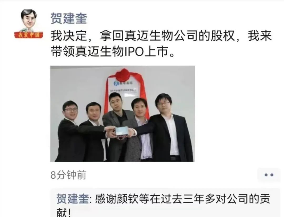 12月12日,贺建奎朋友圈发布消息称:我决定,拿回真迈生物公司的股权,我来带领真迈生物IPO上市。同时也在评论区写道:感谢颜钦等在过去三年多对公司的贡献!