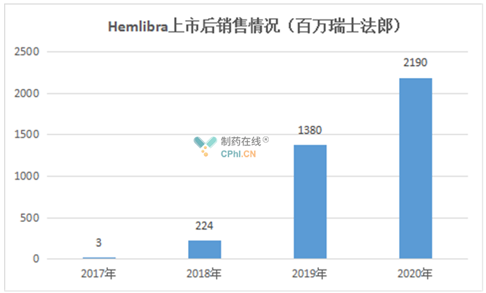 截至目前,Hemlibra已在全球90多个国家被批准用于治疗体内存在因子VIII抑制剂的A型血友病A患者,在全球80多个国家被批准用于治疗体内不存在因子VIII抑制剂的A型血友病患者,大约8200例患者接受了Hemlibra治疗。据公司财报,Hemlibra上市后销售额逐年攀升,2020年达到21.9亿美元。
