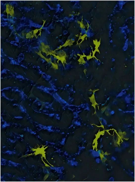 肝脏巨噬细胞,或者说库普弗细胞(Kupffer cell)分泌IL-12蛋白,导致免疫疗法的不良反应,用黄色表示。血管用蓝色表示。图片来自UNIGE - Mikaël Pittet。