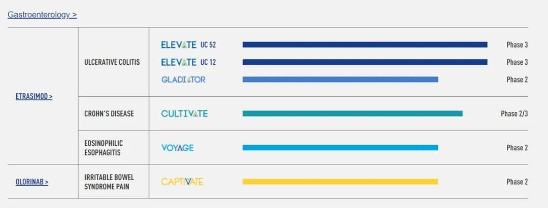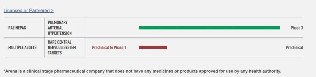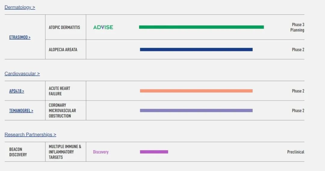 ARENA Pharmaceuticals 管线针对胃肠病,皮肤病和心脏病,包括八个适应症的四种研究药物和十一个正在进行或计划中的临床试验。Arena在皮肤科的主要研究化合物etrasimod是一种高选择性的口服1-磷酸鞘氨醇(sphingosine1-phosphate,S1P)受体调节剂,旨在对特定的免疫细胞类型产生全身和局部效应,有可能治疗多种免疫介导的炎症性疾病,包括溃疡性结肠炎,克罗恩病、嗜酸性食管炎、特应性皮炎和斑秃。