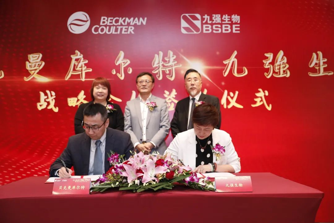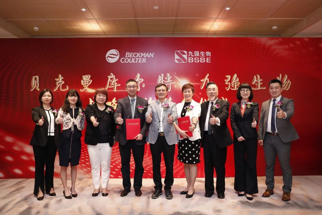 全国卫生产业企业管理协会副会长宋海波教授;贝克曼库尔特全球副总裁、中国区总经理姜植铭博士、市场总监洪军先生及贝克曼库尔特团队;九强生物董事长邹左军博士、副总经理双赫女士及九强生物团队出席签约仪式。