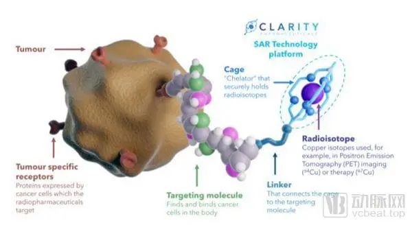 针对上述问题,Clarity的SAR技术平台研发了一种适用于铜同位素,具有高度特异性和高度稳定性的螯合剂,可保留铜同位素并防止其泄漏到体内。螯合剂与靶向分子相连,该靶向分子可以发现并结合癌细胞上的肿瘤特异性受体。一旦靶向分子发现肿瘤,放射性同位素就可以在该位置发挥作用,发射辐射供成像设备追踪(诊断性放射性同位素Cu-64)或破坏癌细胞(治疗性放射性同位素Cu-67)。