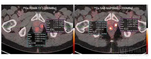 另一项是针对前列腺I期的PET成像试验(PROPELLER),计划对30名已确诊前列腺癌但还未进行前列腺切除手术的患者使用67Cu-SAR-bisPSMA进行治疗。目前,15名参与者已经完成了67Cu-SAR-bisPSMA诊断。诊断结果显示,67Cu-SAR-bisPSMA拥有比68Ga-Ma-11更高的标准化摄取值(SUVmax值)。该项试验的首席研究员Louise Emmett教授表示,更高的肿瘤摄取意味着它们在PET扫描中更明显,因此被检测到的机会更高。