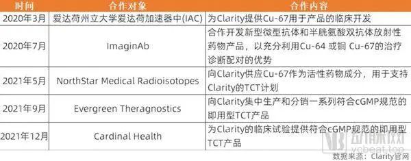 Clarity积极开展合作,目前已经同爱达荷州立大学爱达荷加速器中(IAC)、ImaginAb、NorthStar Medical Radioisotopes、Evergreen Theragnostics、Cardinal Health等签订了合作协议,保证放射性同位素铜和TCT产品的持续供应。