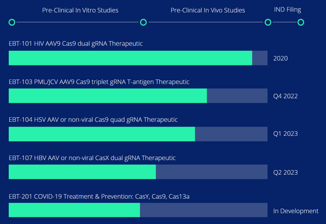 除了基于CRISPR的艾滋病疗法之外,该公司的研发管线还包括使用CRISPR技术清除乙肝病毒(HBV)、单纯疱疹病毒(HSV)、乳头多瘤空泡病毒(JCV),以及当前仍在暴发的新冠病毒(SARS-CoV-2)。