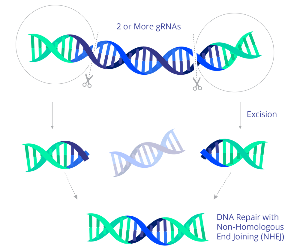 众所周知,CRISPR-Cas9基因编辑能够精准地对DNA双链进行切割,导致DNA双链断裂,基于这一原理,我们可以通过CRISPR-Cas9对已经整合到人体染色体中的HIV病毒基因组进行切割。但是,如果只切割一个位点,那么它们很容易进行修复,而且容易导致被切割位点附近发生基因变异。该疗法则使用了多次切割,以彻底打碎HIV病毒基因组,从而实现对HIV病毒的彻底清除。
