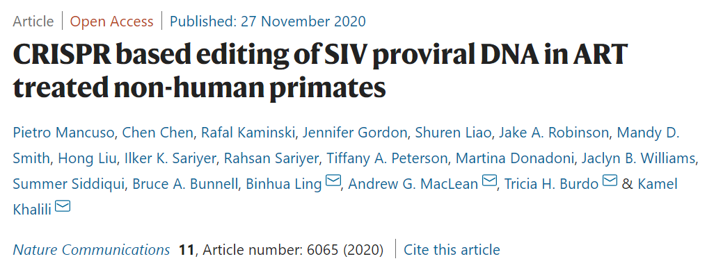 2020年11月,美国天普大学和内布拉斯加大学医学中心的研究人员在 Nature Communications 期刊上发表研究论文。成功地在非人灵长类动物的基因组中编辑并清除了与HIV密切相关的SIV-a病毒,这在艾滋病研究中迈出了重要一步。这一突破也使得人类比以往任何时候都更接近于开发出彻底治愈艾滋病的方法。
