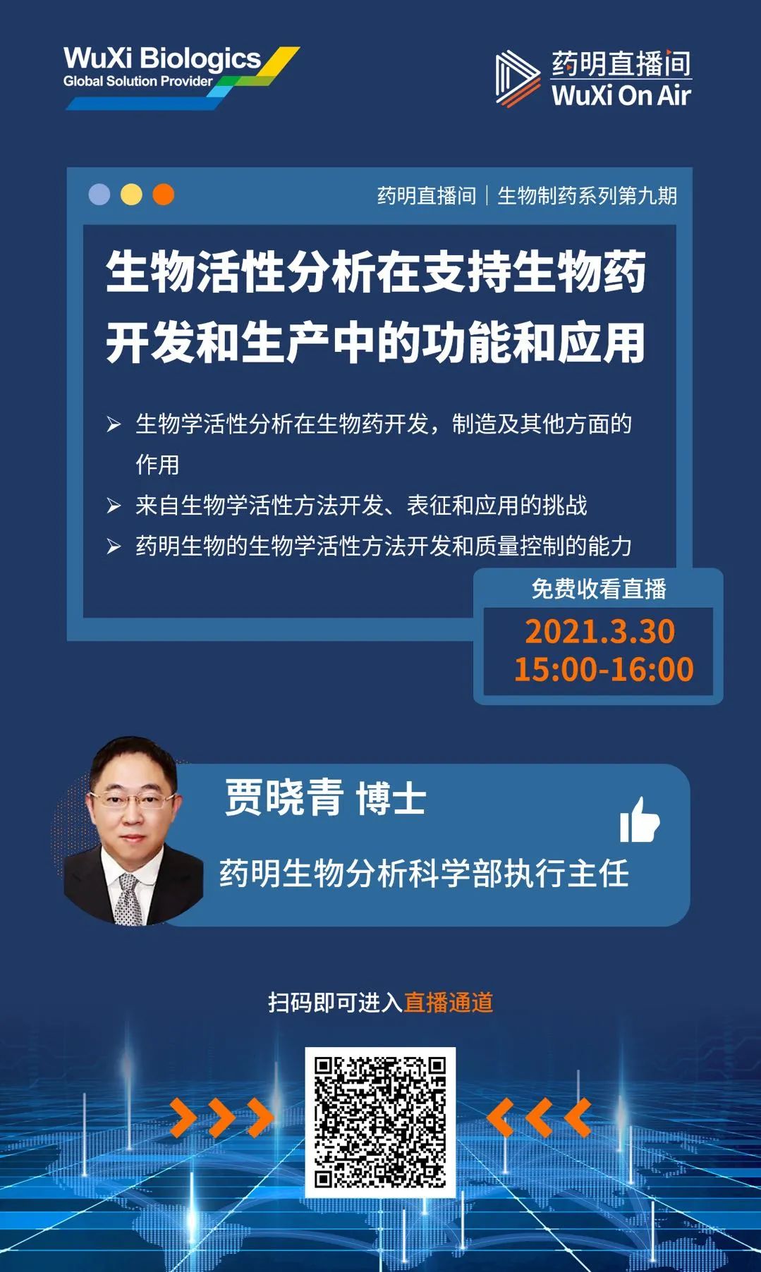 3月30日下午三点,药明生物分析科学部执行主任、贾晓青博士将做客药明直播间,向大家介绍生物学活性分析在生物药开发,制造及其他方面的作用,结合生物学活性方法开发、表征和应用的挑战,分享团队在生物学活性方法开发和质量控制的能力。欢迎大家一起参与讨论!