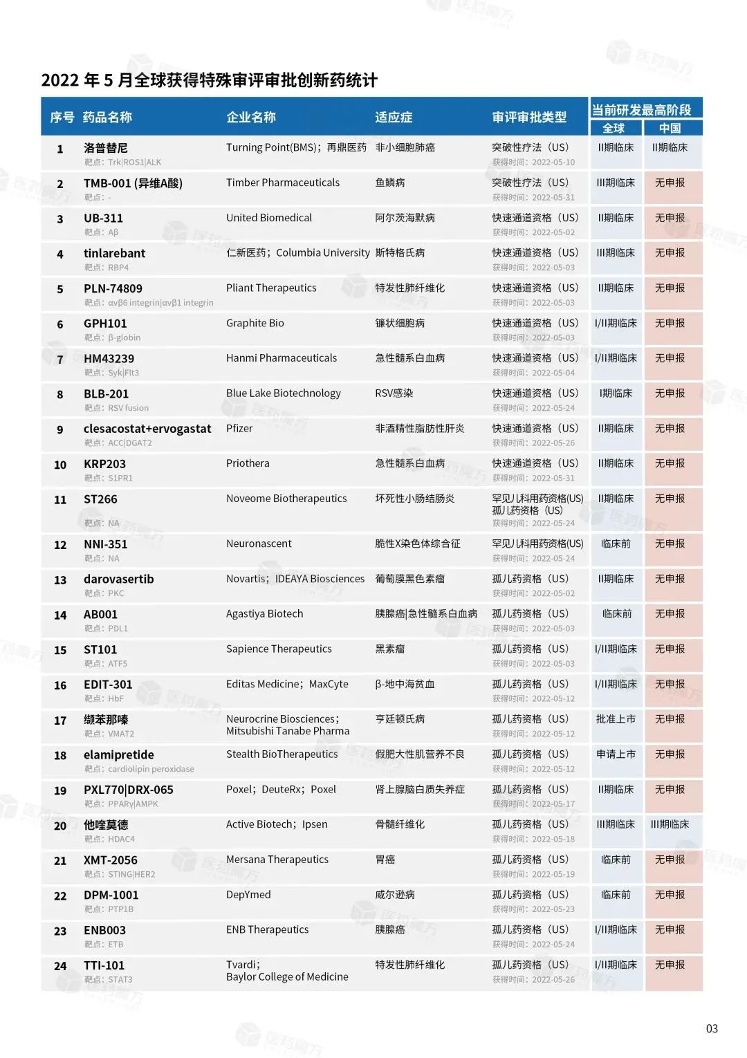 2)注册进展:突破性疗法,FIRST IN CLASS/BEST IN CLASS产品首次获批等信息。