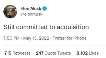 图丨马斯克发推文称,仍致力于收购推特(来源:Twitter)