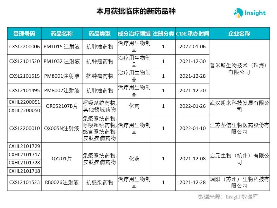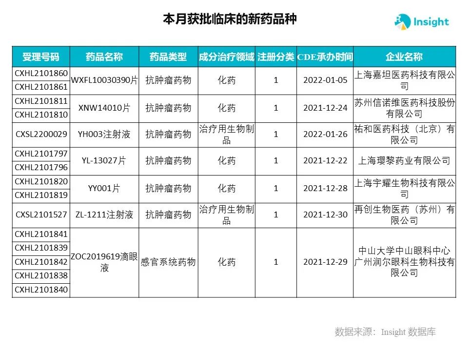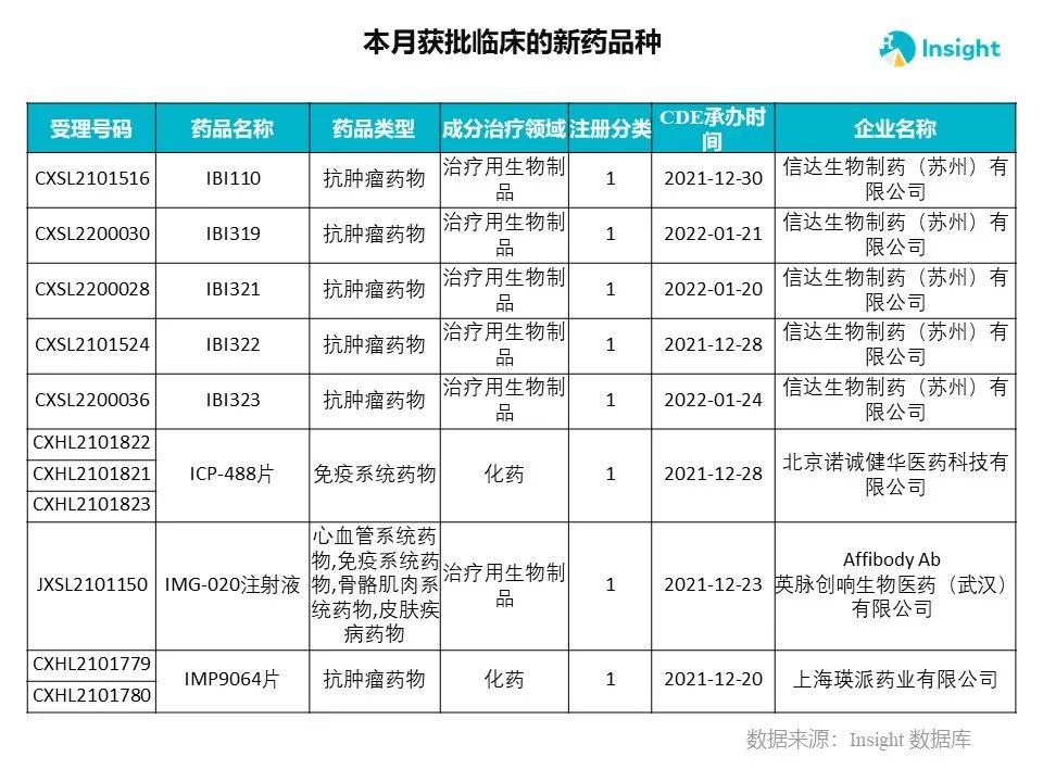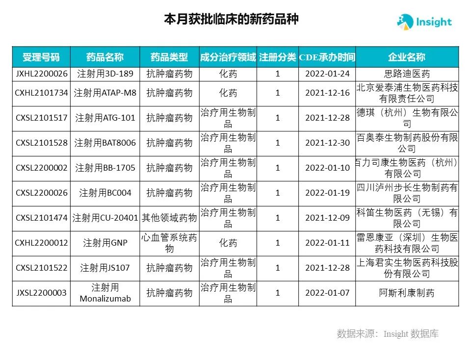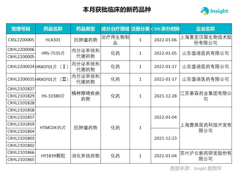 Insight 数据库(https://db.dxy.cn/v5/home/)申报进度库显示,2022 年 3 月获批临床的新药共有 230 个受理号,涉及 145 个品种,下图为具体名单: