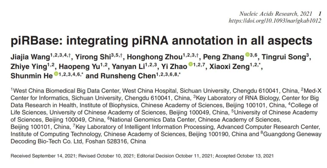 2021年12月6日,四川大学华西医院生物医学大数据中心陈润生院士工作站团队、曾筱茜副教授团队和中国科学院生物物理研究所健康大数据研究中心何顺民研究员团队共同在Nucleic Acids Research杂志上,发表文章piRBase: integrating piRNA annotation in all aspects ,从多个方面对piRNA数据资源进行了整合分析和注释,为piRNA的功能研究提供了重要支撑。