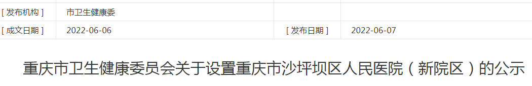 重庆大学附属沙坪坝医院(重庆市沙坪坝区人民医院)新院区,医院规划床位1200张。该工程是重庆市沙坪坝区重点民生工程,定位国家三级甲等综合教学医院。项目位于沙坪坝区G212平安大道旁,建设项目总投资约22亿元,占地面积101亩,建设面积约22.8万平方米,是现有规模的10倍。未来,该医院将形成“一院三区”的新发展格局,实现从“病有所医”向“病有良医”转变提升,最大限度发挥功能效益,满足群众更多的就医需求。