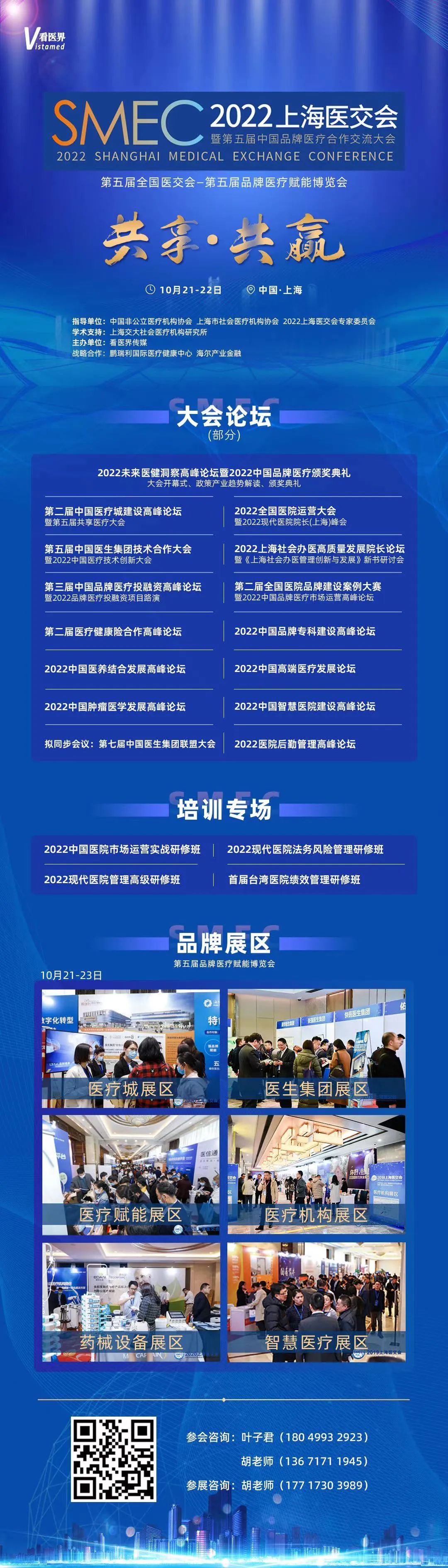10月21-23日,年度医疗行业盛会2022上海医交会(第五届全国医交会-第五届医疗赋能博览会)将在上海隆重举行,大会同步举办2022全国医院运营大会暨现代医院院长上海峰会,论坛精彩纷呈,并设置品牌医疗城、医疗机构、医生集团、药械设备、智慧医疗、医疗赋能、共享医疗等展区,欢迎报名参会参展,洽谈合作。