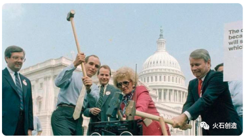 美国国会议员在国会大厦门口抡起大锤砸毁了一台日本东芝的收音机