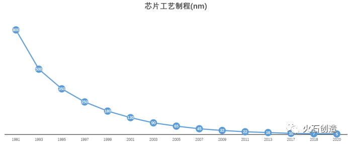 (从800nm开始,制程变化:0.8 μ m、0.5 μ m、0.35 μ m、0.25 μ m、0 .18 μm、0.13 μ m、90nm、65nm、45nm、32nm、22nm、16nm、10nm、7nm,5nm)