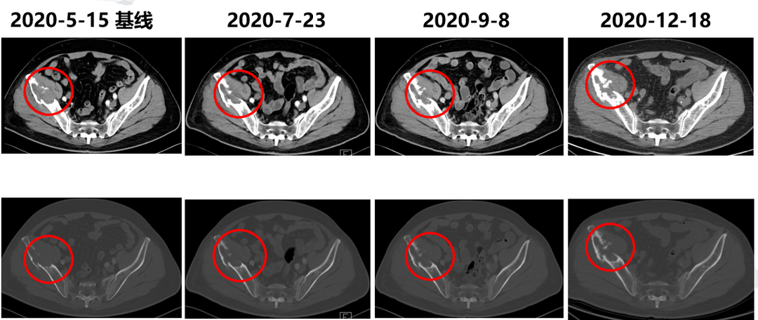 患者治疗前后骨转移灶影像对比:10周期后(2020年12月18日)疗效评价达到PR