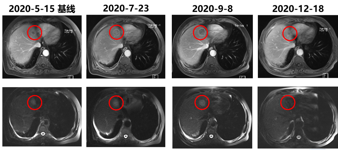 患者治疗前后肝转移灶影像对比:10周期后(2020年12月18日)疗效评价达到PR