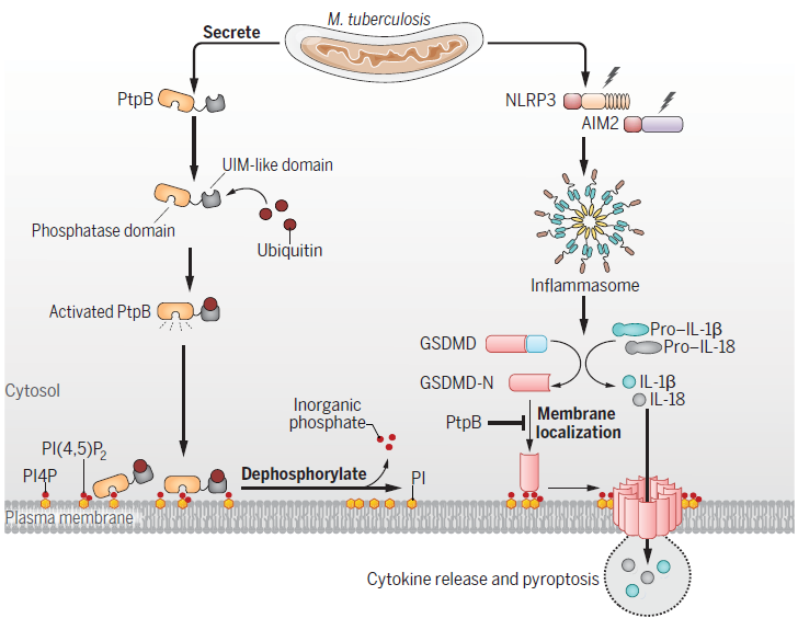 是宿主炎症小体—细胞焦亡通路的潜在抑制分子。进一步的研究表明,PtpB在Mtb感染时可定位至宿主细胞质膜并依赖其磷酸酶活性去磷酸化质膜上的磷脂酰肌醇-4-单磷酸(PI4P)及磷脂酰肌醇-(4,5)-二磷酸(PI(4,5)P2),从而抑制GSDMD-N在质膜上的聚集并阻止细胞焦亡及细胞因子IL-1β和IL-18的释放。