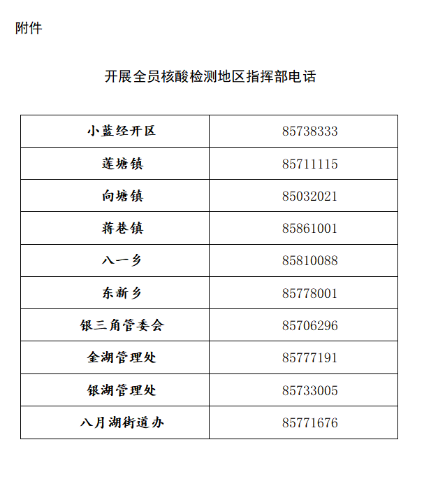 按照南昌突发疫情防控前方指挥部的统一安排,决定5月19日在我县(区)控规区内的乡镇(含莲塘镇、向塘镇、东新乡、八一乡、八月湖街道办、银三角管委会),小蓝经开区(含金湖管理处、银湖管理处)及蒋巷镇开展全员核酸检测,具体内容公告如下: