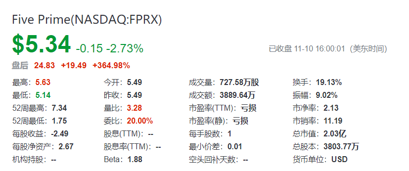 受此消息刺激,Five Prime公司股价在收盘后大涨364%。