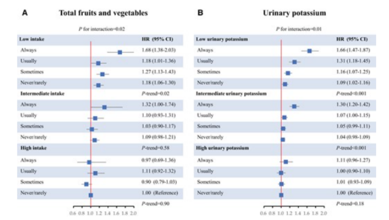 :研究发现在食物中添加盐与全因过早死亡风险的正相关关系似乎随着蔬菜和水果总摄入量水平的增加而减弱,换言之,在蔬菜和水果总摄入量水平较低的参与者中,在