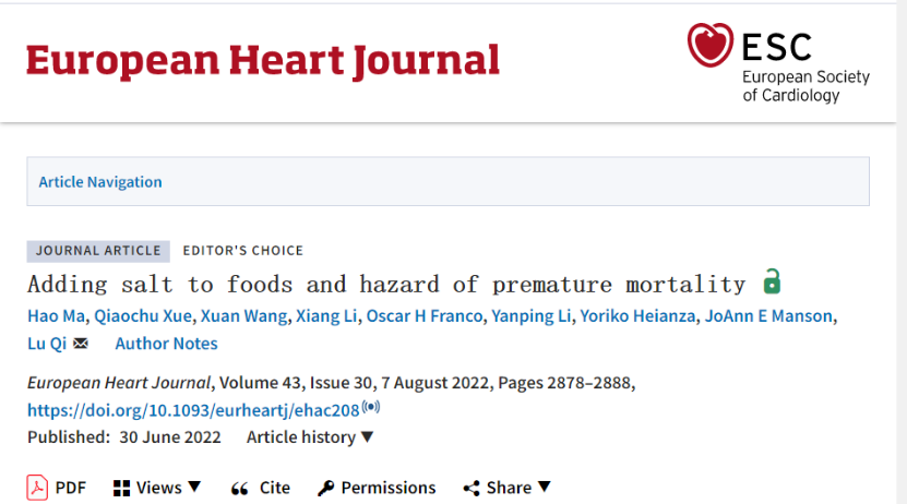 [2] Hao Ma, Qiaochu Xue, Xuan Wang, Xiang Li, Oscar H Franco, Yanping Li, Yoriko Heianza, JoAnn E Manson, Lu Qi, Adding salt to foods and hazard of premature mortality, European Heart Journal, Volume 43, Issue 30, 7 August 2022, Pages 2878–2888, https://doi.org/10.1093/eurheartj/ehac208