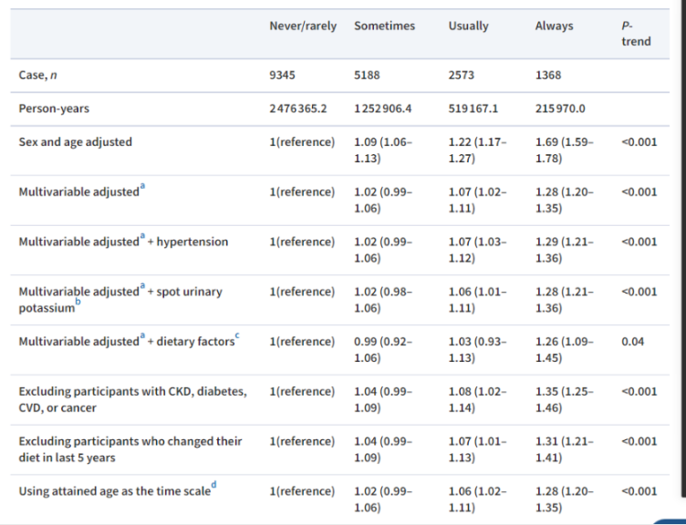 在中位数9年的随访中,记录了18474例过早死亡。在将参与者身体原因、疾病原因等纳入分析调整后,研究发现全因过早死亡的风险随着在食物中添加盐的频率增加而增加。各组校正后的HR分别为1、1.02(95% CI:0.99-1.06)、1.07(1.02-1.11)和 1.28(1.20-1.35),(p<0.001)。对于特定原因的过早死亡,研究发现在食物中添加盐的频率越高,心血管疾病死亡率和癌症死亡率的风险越高,但痴呆死亡率和呼吸系统死亡率的风险并不会升高。