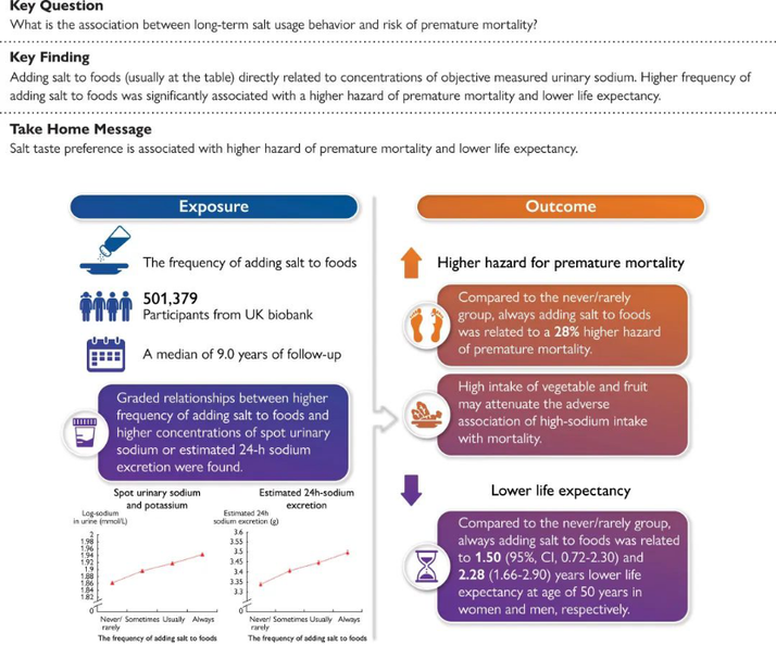 2022年8月《欧洲心脏杂志》发表了相关文章,表明在食物中添加盐的频率越高,全因过早死亡的风险越高,预期寿命越短。
