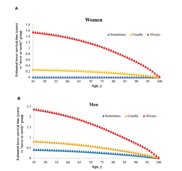 /很少在食物中添加盐的参与者相比,女性和男性在60岁时平均预期寿命分别降低1.37年(95%CI:0.66–2.09)和2.04年(95%CI:1.48–2.59)。