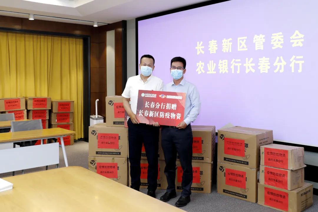 会上,农行长春分行向长春新区捐赠了口罩、消毒液等一批防疫物资。