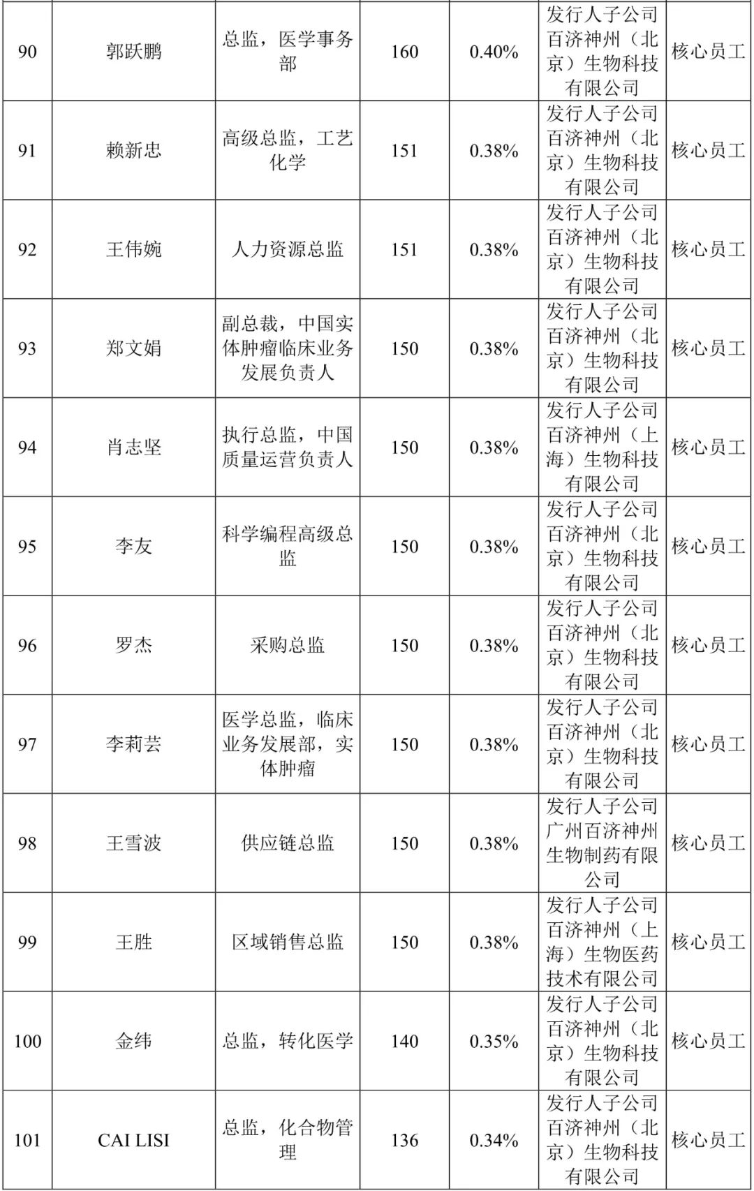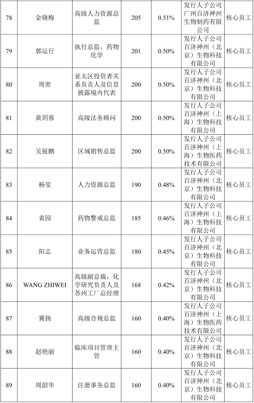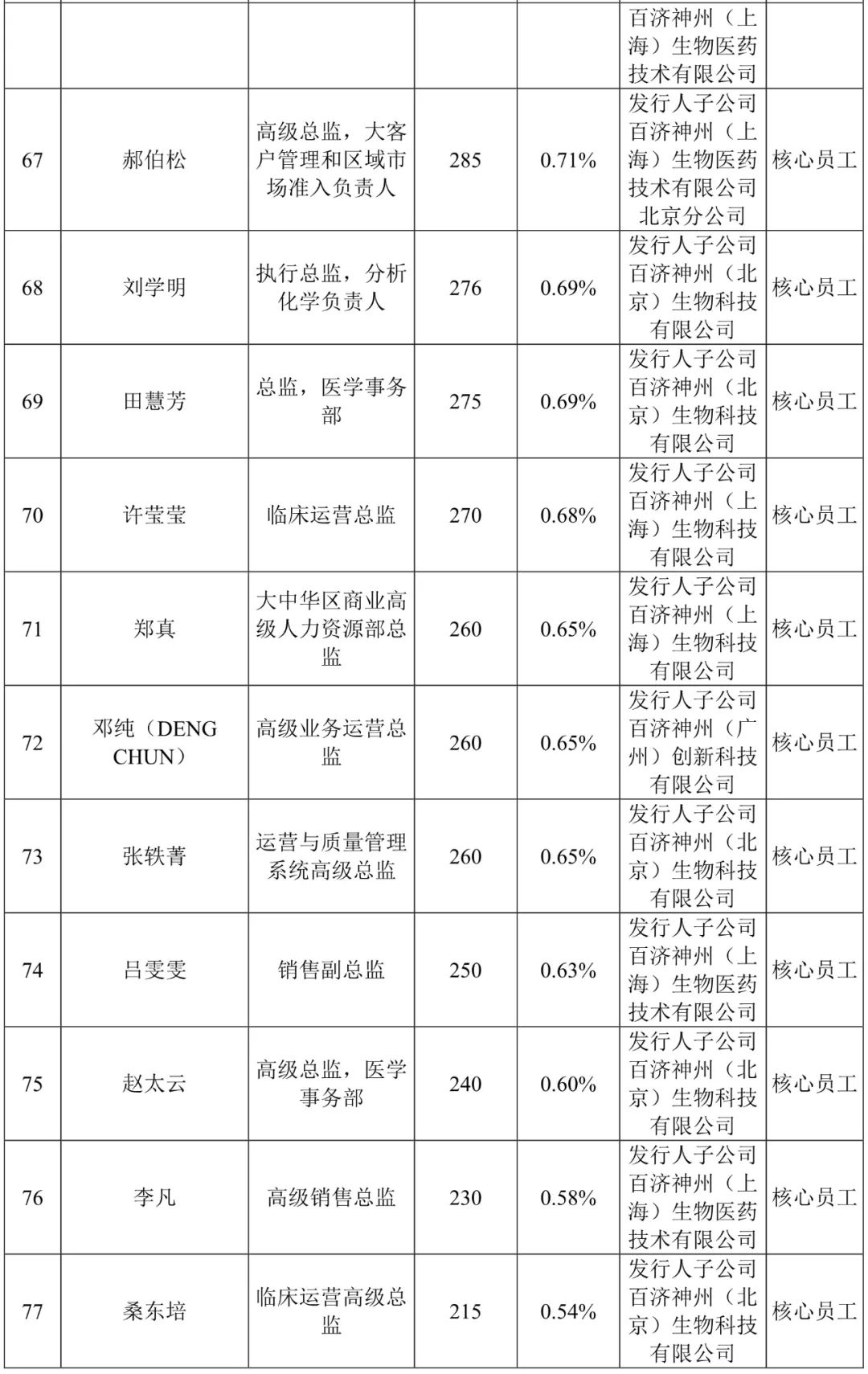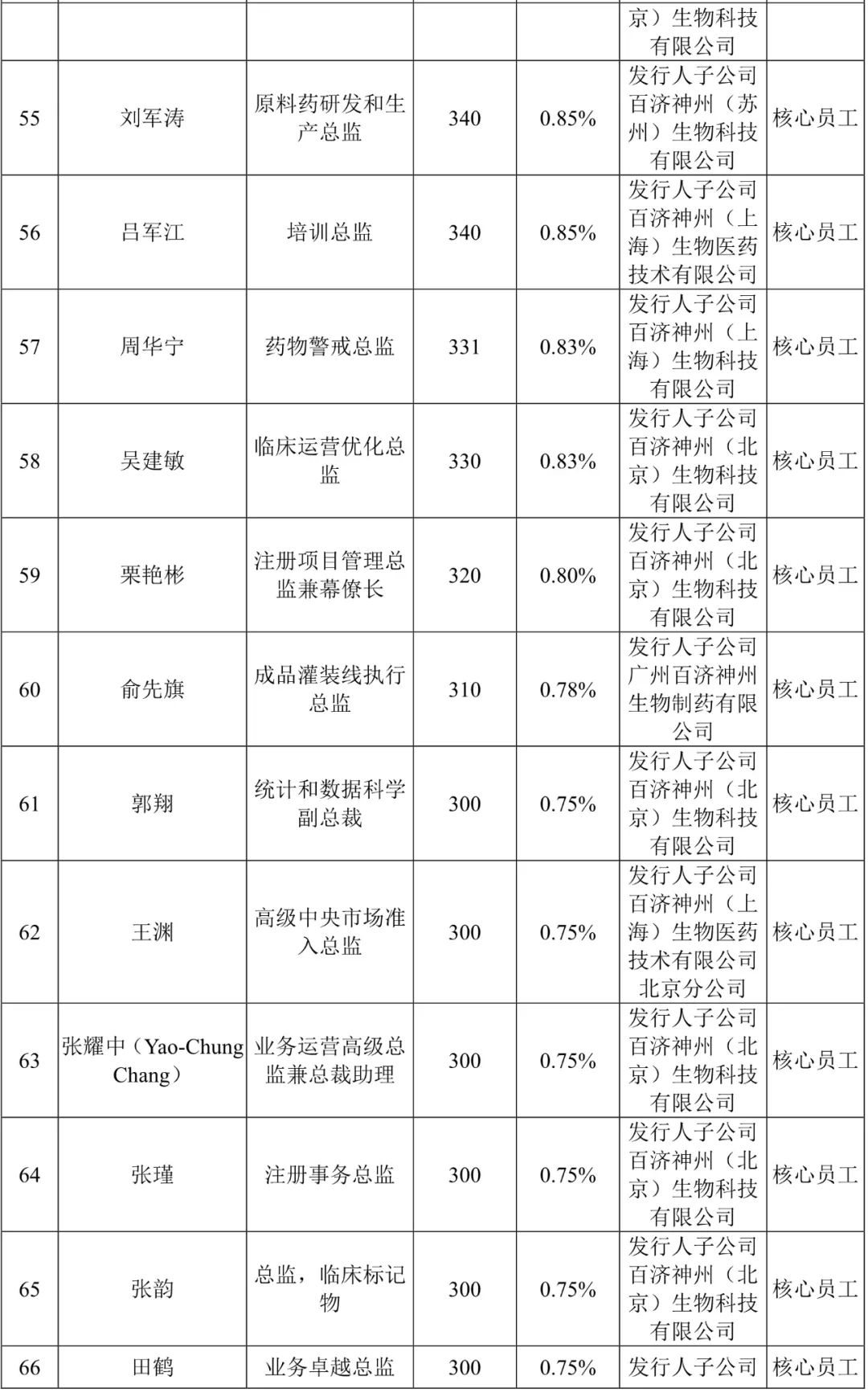 本次IPO,百济神州执行了高管及核心员工(总监级别及以上)的配股计划,最低配售金额为100万元,最高为1500万元。137名高管或核心员工共认购207万股,认购规模为4亿元。
