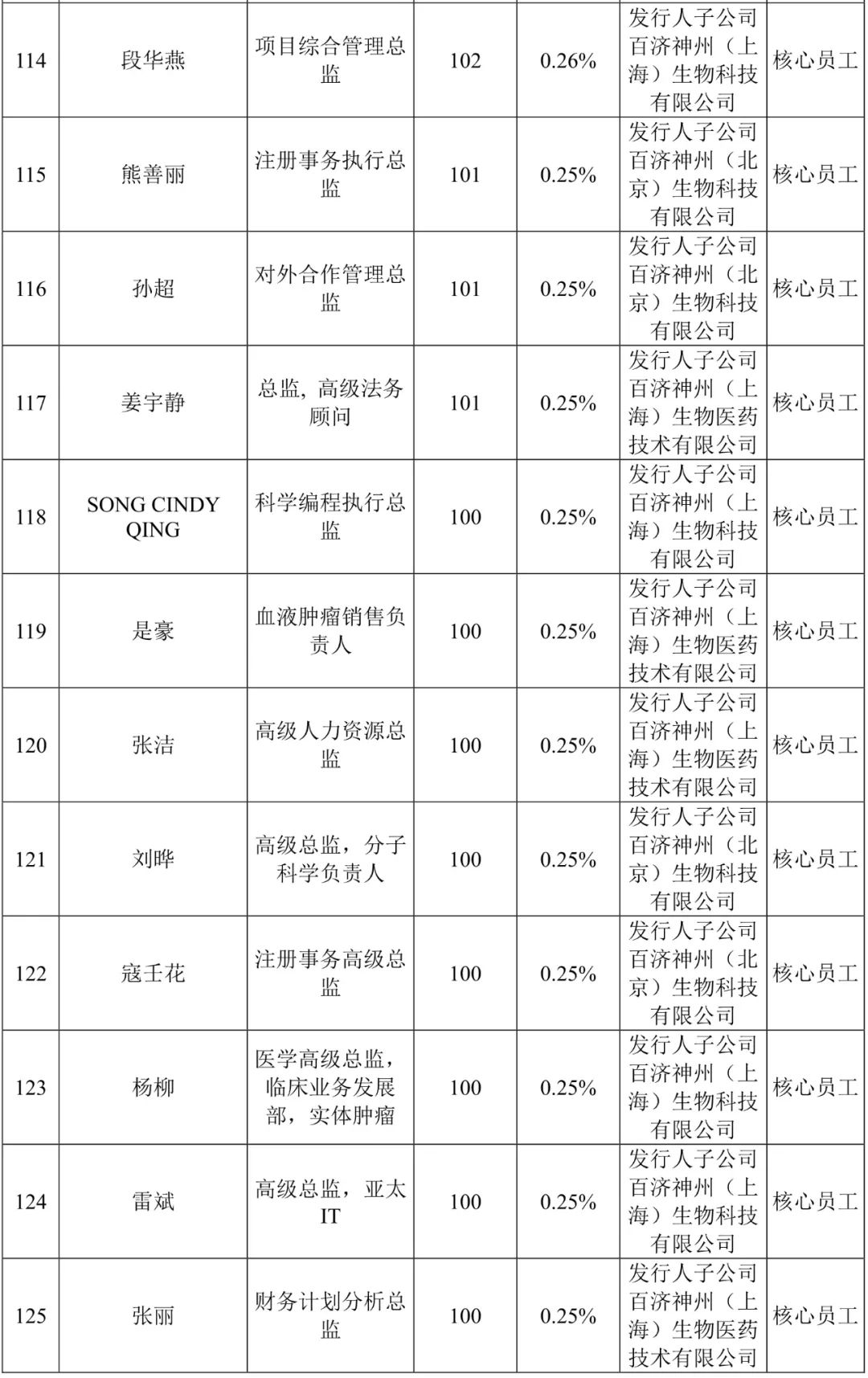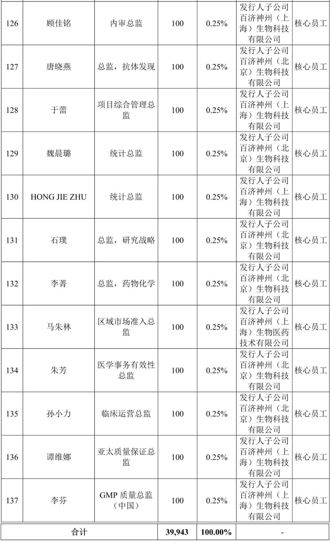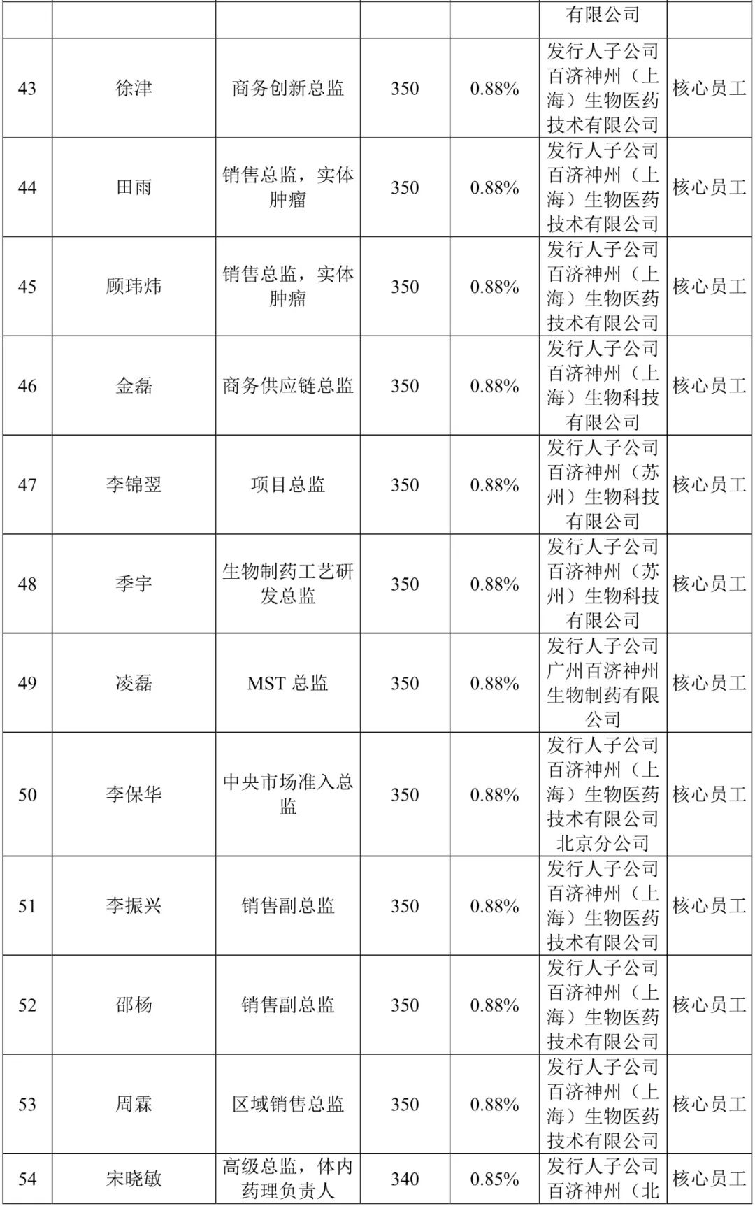本次IPO,百济神州执行了高管及核心员工(总监级别及以上)的配股计划,最低配售金额为100万元,最高为1500万元。137名高管或核心员工共认购207万股,认购规模为4亿元。