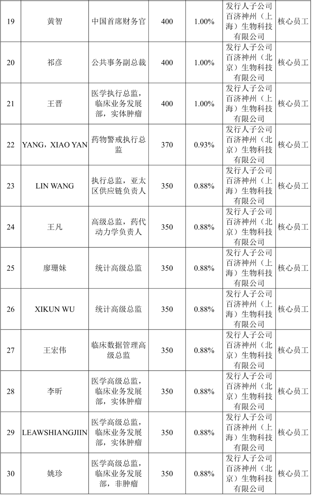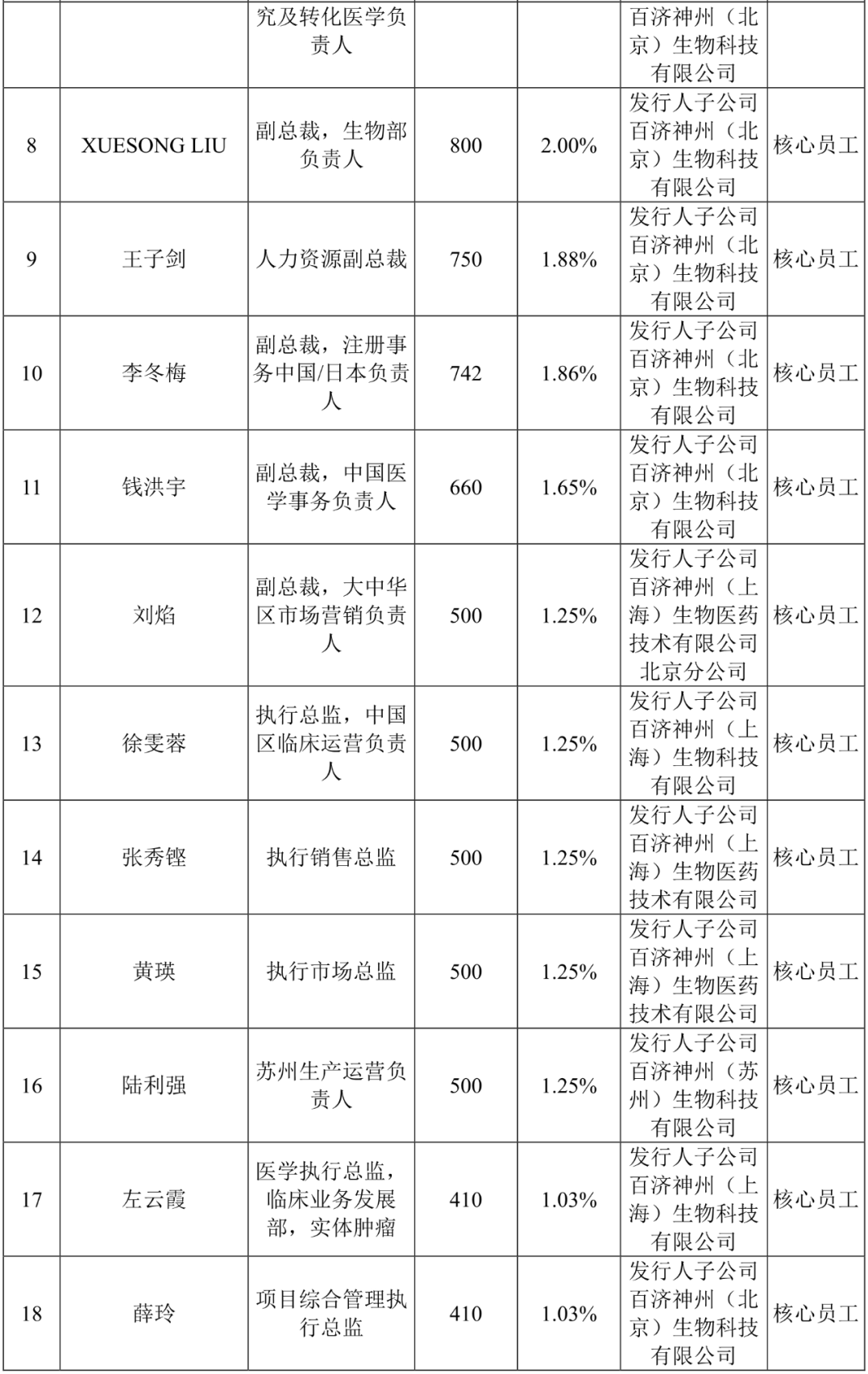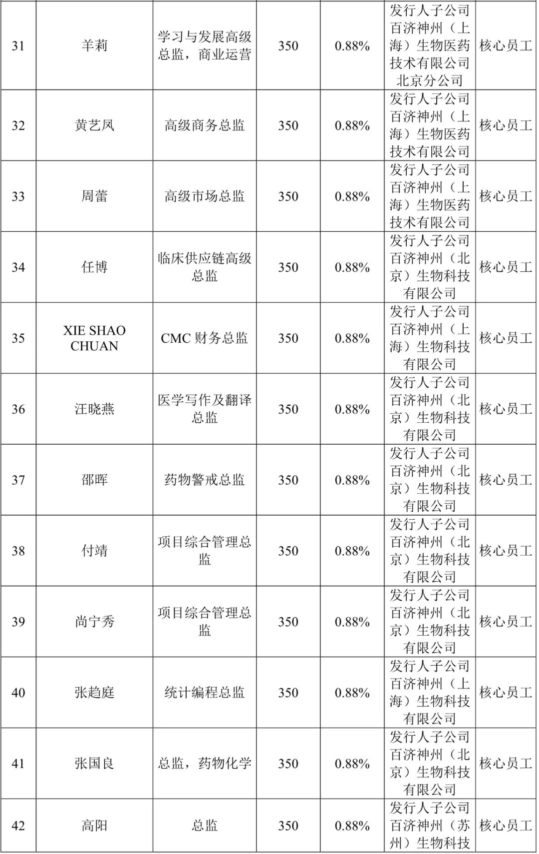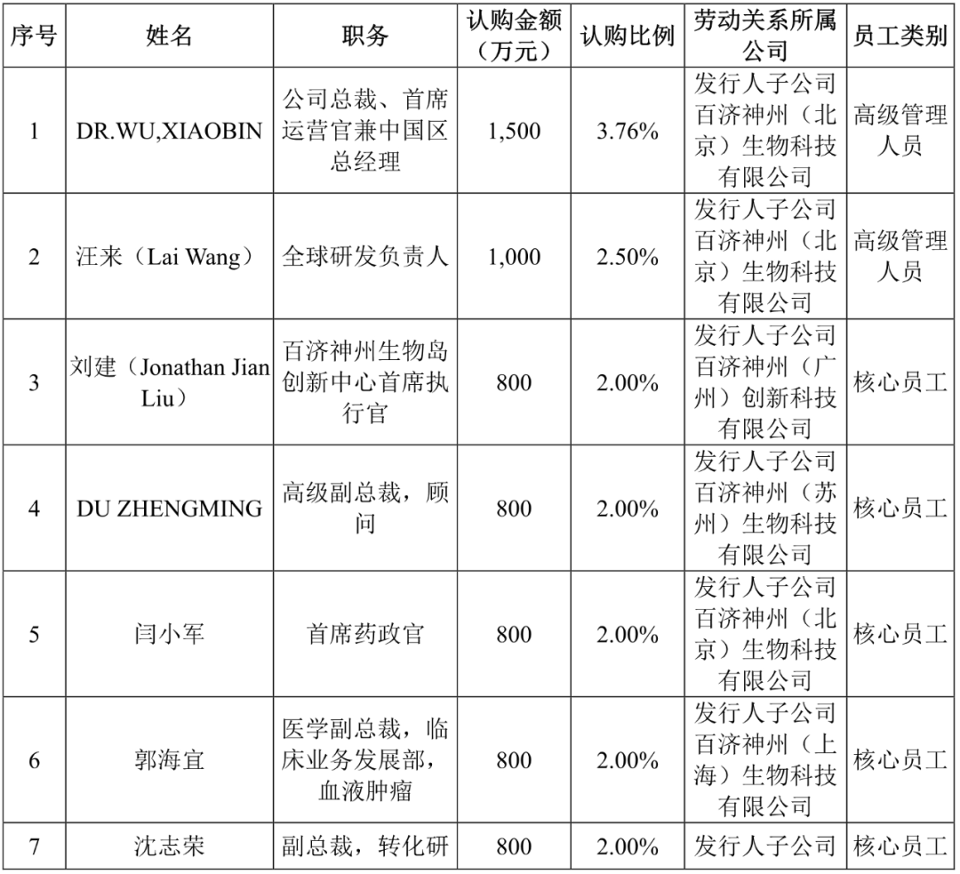本次IPO,百济神州执行了高管及核心员工(总监级别及以上)的配股计划,最低配售金额为100万元,最高为1500万元。137名高管或核心员工共认购207万股,认购规模为4亿元。