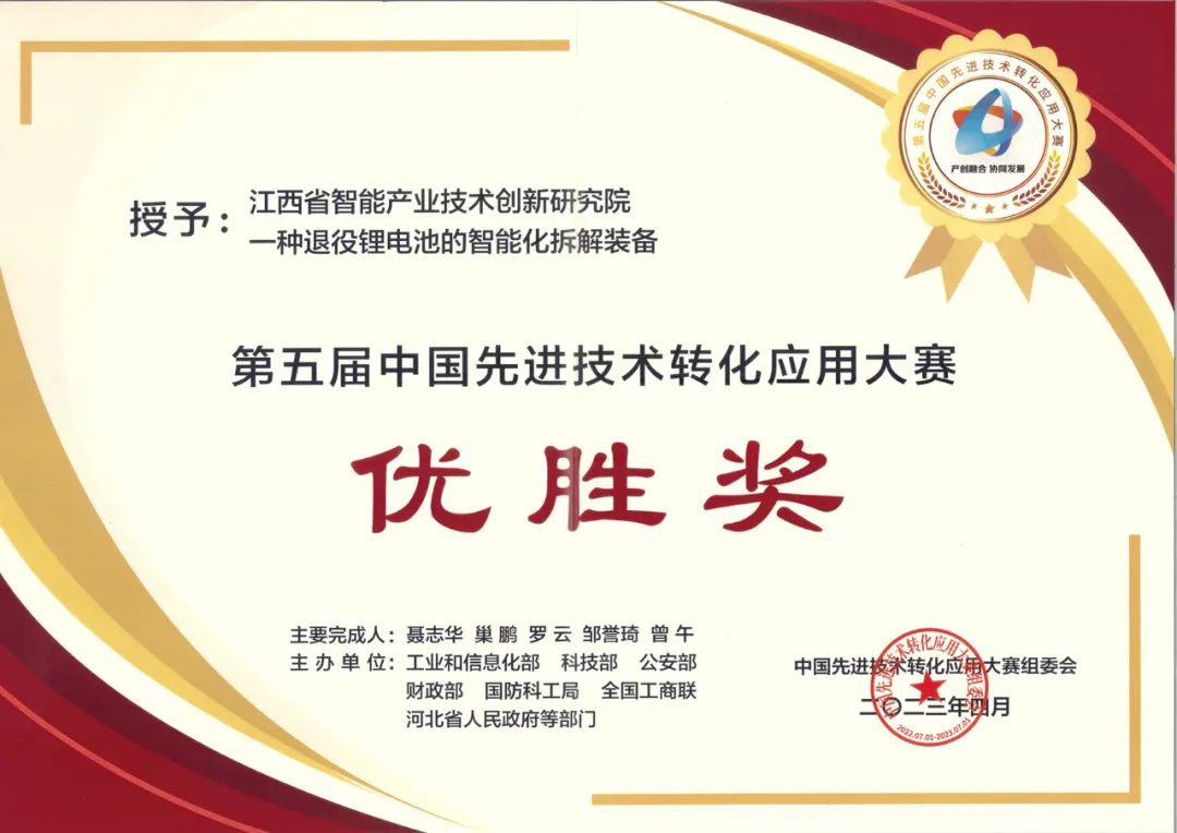 获奖项目 “一种退役锂电池的智能化拆解装备”,是 基于新能源汽车锂电池的回收利用的市场前景, 对报废锂 电池回收拆解需求进行技术研究与攻关, 综合运用机电一 体化、工业机器人与 AI 机器视觉等关键技术,采用纯物理 方式对废旧锂电池卷芯的正极、负极、隔膜进行精细化拆 解与回收利用,技术成熟度已达到八级标准,成功实现了 绿色环保的少人化作业, 具有强兼容、 低能耗、高效率、 无污染等特点。值得一提的是,该项目与赣锋锂业循环科 技达成合作,并入选 2022 年新余市科技局“揭榜挂帅”项 目。