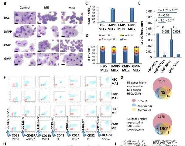 人类HSC和CMP,而非LMPP或GMP是MLL融合介导的转化的细胞靶标。Functional reconstruction of human AML reveals stem cell origin and vulnerability of treatment-resistant MLL-rearranged leukemia. DOI: 10.1126/scitranslmed.abc4822
