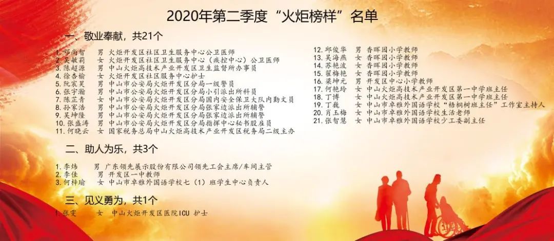 据了解,围绕“推好人、评好人、学好人、做好人、敬好人”等主题,火炬区组织各社区各部门各单位广泛开展助人为乐、见义勇为、诚实守信、敬业奉献、孝老爱亲等各类“火炬榜样”评选,2020年各战线涌现出一批批先进模范,全区获火炬榜样称号共83人。