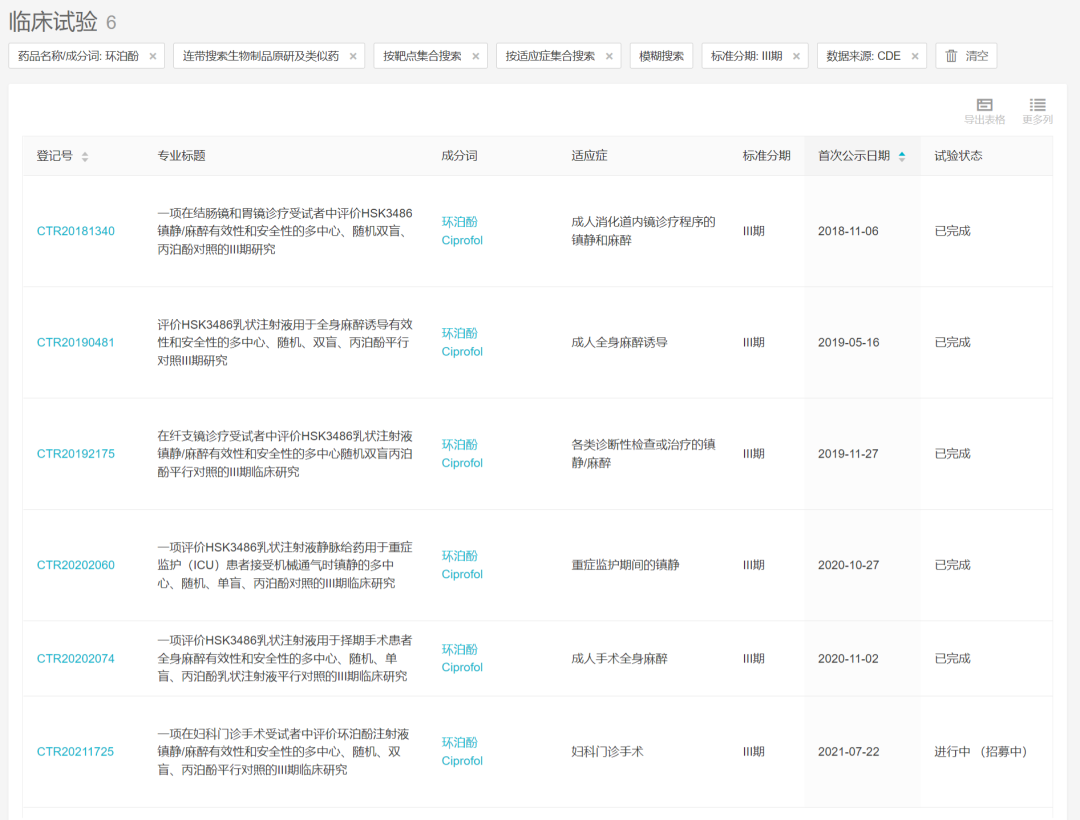 根据 Insight 数据库,海思科目前针对环泊酚启动了 6 项 3 期临床,其中 5 项已完成,大概率对应其申报的 5 项适应症。本次获批的适应症应为后 3 项之一:纤支镜诊疗镇静/麻醉、重症监护(ICU)期间镇静、成人手术全身麻醉。此外妇科门诊手术镇静/麻醉的 III 期临床也在进行中。
