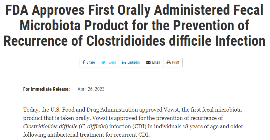 美国当地时间4月26日,FDA宣布批准Seres Therapeutics公司口服微生物组疗法Vowst(SER-109)上市,用于在18岁以上成人中预防艰难梭菌感染(CDI)复发,这些患者曾经接受过抗生素治疗。新闻稿指出,这是FDA批准的首款口服粪便微生物组疗法,代表着微生物组疗法研发的重要里程碑。
