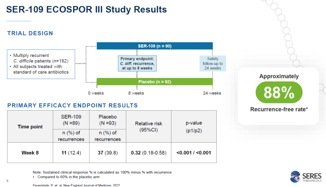 Vowst的有效性在关键性3期临床试验ECOSPOR III中进行了评估,89名参与者接受Vowst治疗,93名参与者接受安慰剂治疗。结果显示,8周后Vowst组的CDI复发率为12.4%,低为于安慰剂组的39.8%。同时,与安慰剂组相比,Vowst组的疾病复发相对风险为0.32(95% CI,0.18,0.58)。这项临床试验的结果已经在《新英格兰医学杂志》和《美国医学会杂志》上发表。去年10月,Vowst的生物制品许可申请获得美国FDA授予优先审评资格。