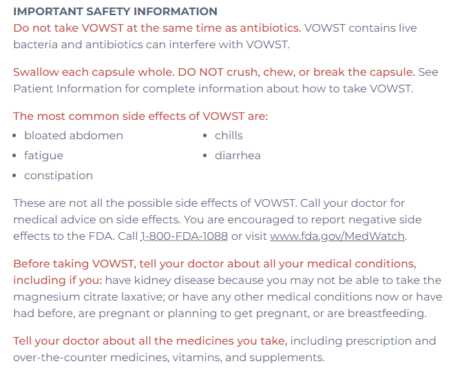 Vowst的给药方案是每日口服一次,每次四粒胶囊,连续服用三天。
