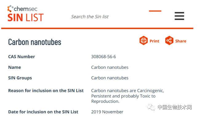 国际化学秘书处(ChemSec)更新了SIN(需要及时被替代的材料)清单,将碳纳米管(CNT)列入其中