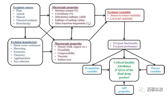 制剂厂家应对辅料厂家进行供应商审计,尽可能了解到辅料生产工艺、质量控制等信息。有时需要结合制剂项目、辅料的生产工艺、过程控制等信息来制定辅料内控质量标准。根据下图中提示的辅料对CQAs的影响,在处方工艺的开发部分要关注来源、生产工艺、微观性质、宏观性质、批间差异等内容。