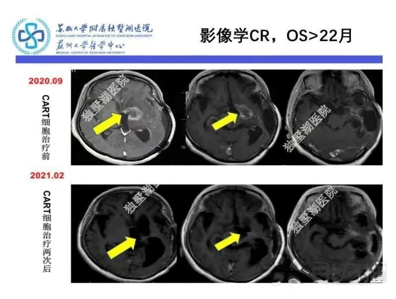 近日从苏州大学附属第一医院神经外科主任医师、苏州大学医学中心(苏州大学附属独墅湖医院)神经外科主任黄煜伦教授处获悉:在黄煜伦团队和合作单位的共同努力合作下,经过两年多的研究者发起临床试验,最近,三例复发的晚期胶质母细胞瘤患者呈现了100%的客观有效率。通过2-6个疗程新型CAR-T细胞治疗,核磁共振显示:1例患者呈现完全有效(CR),即肿瘤完全消失,截止发稿日,CR已持续5个半月。两例患者呈现部分有效(PR),肿瘤缩小在40%-80%之间。入组时间最长的一位患者在复发后已经存活超过22个月(复发胶质瘤患者平均生存期为6个月左右),并且目前情况良好。这些研究成果为晚期复发胶质瘤患者带来了曙光,也代表着一个重要的里程碑。