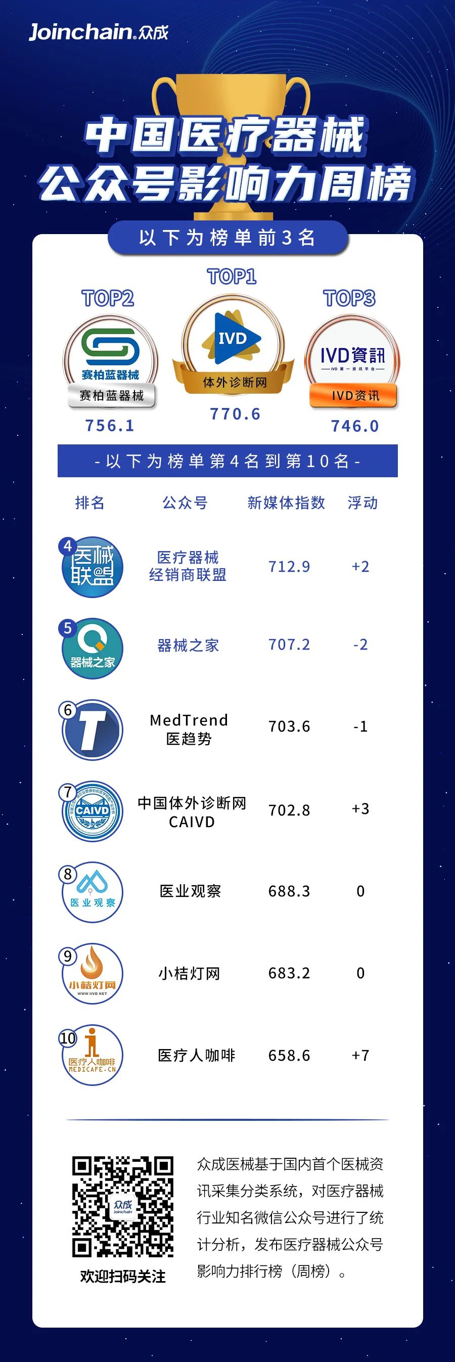 在近5周中国医疗器械公众号影响力周榜中前5名的情况如下: