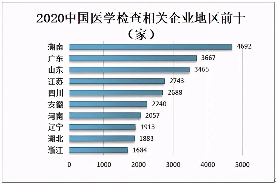 截至2021年2月1日,中国共有4.57万家医学检验相关企业。2020年中国检查相关企业数量中,湖南省以4692家企业排名第一,其次是广东医学检查相关企业为3667家,再次是山东医学检查相关企业3465家。